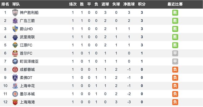 目前神户胜利船、广岛三箭、蔚山HD、武里南联、江原FC、首尔FC分别排在东亚区积分榜前六名,町田泽维亚、成都蓉城、柔佛新山、上海申花、墨尔本城、上海海港排在第七到第十二位。