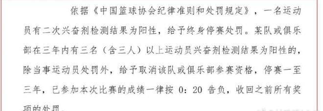 根据CBA的新规定,如果球员在2次兴奋剂检测中呈现阳性,将会被终身禁赛。对于球队(俱乐部),在3年内有3名及以上运动员兴奋剂检测为阳性,则取消该球队(俱乐部)的参赛资格,禁赛期为1-3年,已经参加的比赛全部按照0-20判负,并且收回之前所有的奖项。这样的处罚看起来是非常严重的,显示了CBA总公司和中国篮协反对兴奋剂的决心,也打击了某些球队的违规手段和行为。