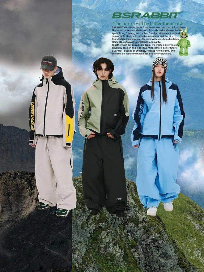 来自韩国的 BSRABBIT ,是创立于 2012 年的韩国品牌,凭借极具标识性的大小孩风格,动物印花和明亮配色吸引了大批颜值至上的性消费者关注。BSRABBIT 的 BS是 SNOWBOARD 和 STREET 的缩写,并以兔子图案作为品牌标识,意为无论是在雪山上还是在路上,都能像兔子一样奔驰。
