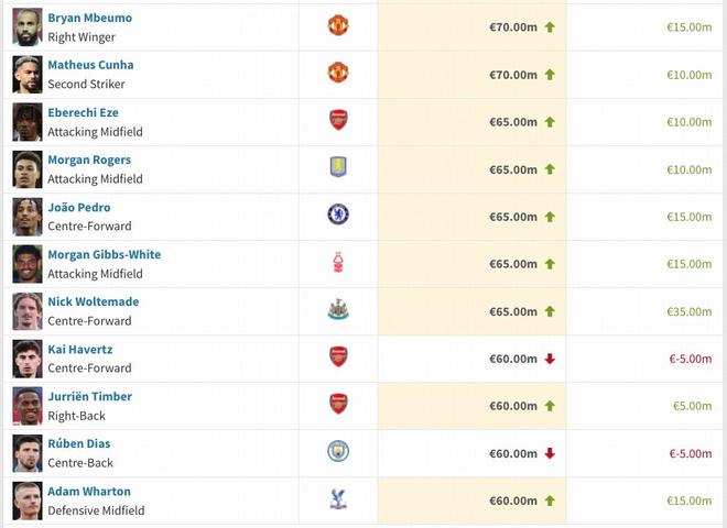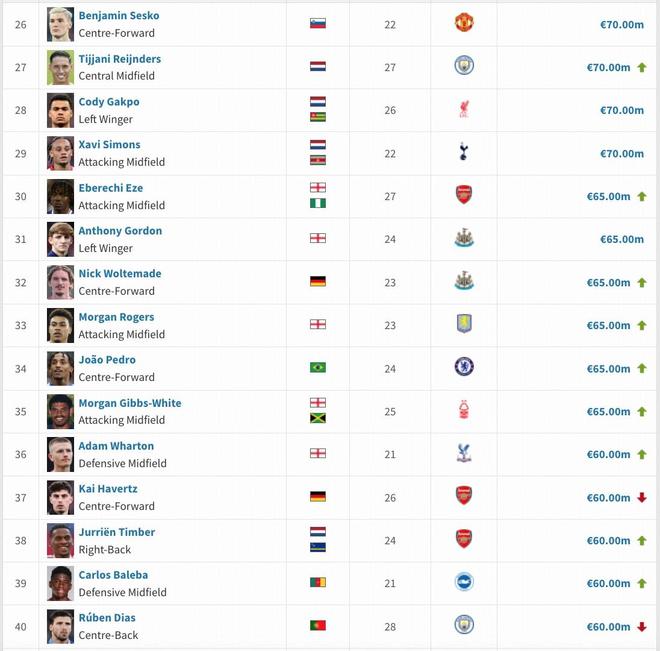 英超身价变更:维尔茨降至1.3亿欧,萨卡降至1.4亿欧,凯塞多升至1亿欧