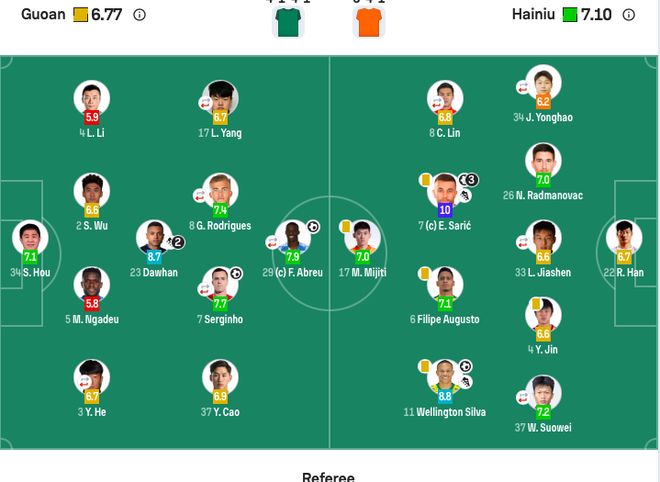 中场:7-塞尔吉尼奥(70’21-张源)、8-古加(F)(85’10-张稀哲)、23-达万(F)、17-杨立瑜(61’11-林良铭)、37-曹永竞;